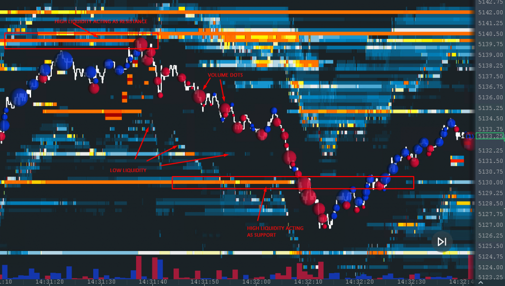 These dots provide a visual representation of the volume traded at various price levels at specific times, enabling traders to pinpoint where significant trades are occurring and gauge market sentiment.
